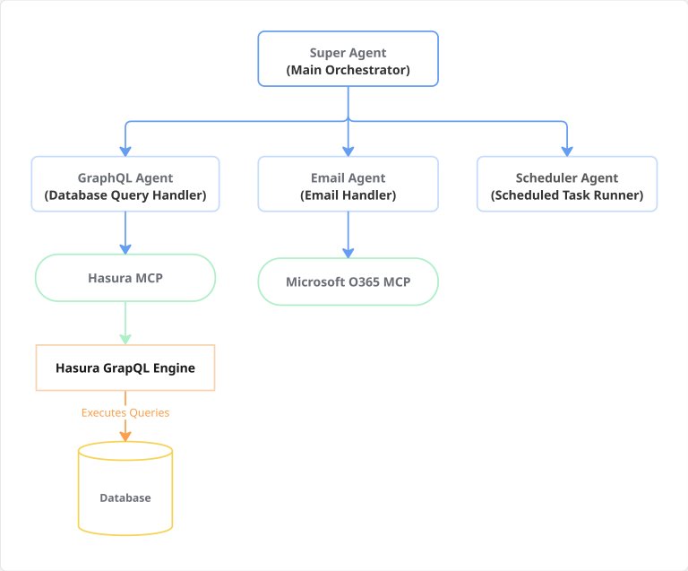 The Super Agent is the entry point. It analyzes user requests and routes them to the right